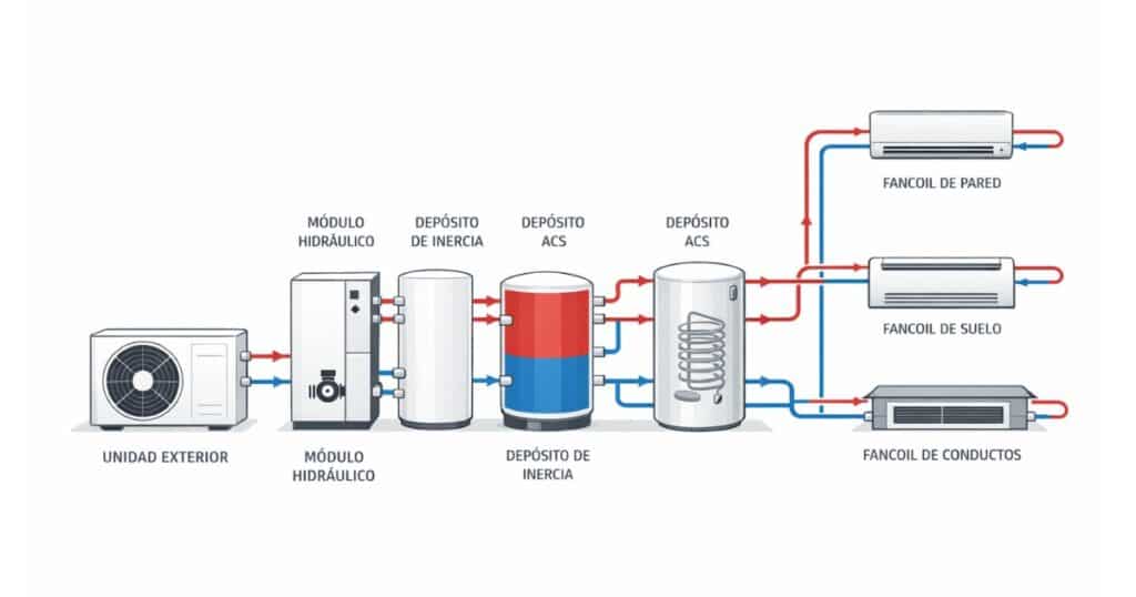 Esquema de instalación de Aerotermia con Fancoils y ACS