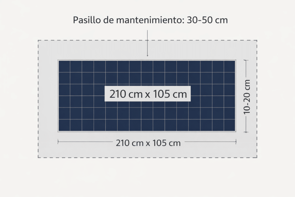 Al calcular el espacio necesario para instalar placas solares, no basta con tener en cuenta las dimensiones del panel. En una instalación real es necesario considerar también los márgenes de seguridad, los pasillos de mantenimiento y la distancia entre filas para evitar sombras.